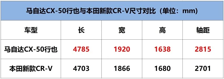 侧面来看,溜背风格明显。此外,还搭载了全景天窗,匹配了19英寸超大轮毂设计。车身数据部分,马自达CX-50行也的长宽高分别为4785/1920/1638mm,轴距是2815mm,车身数据同样越级。参考一下销量很好的本田新款CR-V,数据为4703/1866/1680mm,轴距是2701mm,要知道全新本田CR-V可是一辆七座SUV,差距明显。