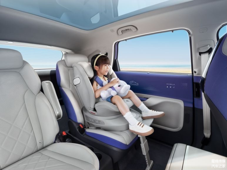 考拉座舱内配备魔方茶几,副驾座椅向前90°折叠后可以成为一个座位,与后排座椅形成面对面的形态。一般情况下这可以是一家人停车休息、露营、吃饭打游戏的互动空间。在宝宝需要更换尿不湿时,面对面的座椅分布可以让宝宝躺在其中一个座椅上,一个人也能轻松更换尿不湿。