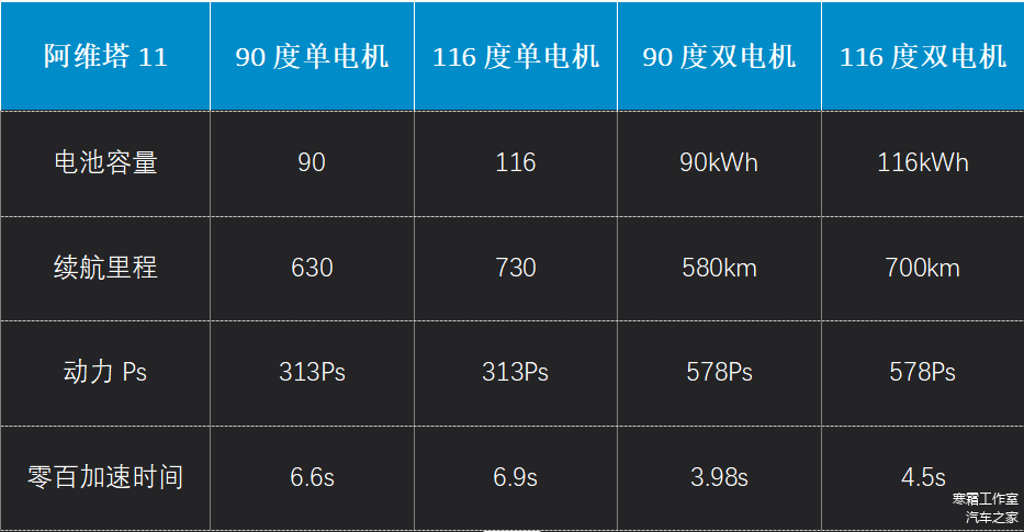 这次阿维塔12上市推出了两个配置,分别为【单电机版】和【双电机版】,两个版本配置相同,只有动力和续航有区别,单电机版最大功率313马力,峰值扭矩370牛米,双电机版最大功率578马力,峰值扭矩650牛米,电池容量和、续航里程和零百加速时间未知,不过大概率和阿维塔11一样,单电机、双电机、90度、116度相互组合,阿维塔11各个配置的指标如下,供大家做个参考,可以确定的是,阿维塔12作为轿车,续航里程和零百加速时间只会比阿维塔11表现更好。