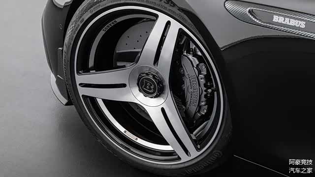 外观方面,BRABUS博速改了一些细节,前脸采用了大量碳纤维装饰部件,包括前唇、进气口装饰、中网格栅等处。此外,尾部的空气扩散器、小鸭尾也都是碳纤维材质的。外观最有意思的地方在于轮圈,BRABUS博速的设计师为其打造了一套三辐式轮毂,采用雾面抛光工艺处理,前轮21英寸,后轮22英寸。