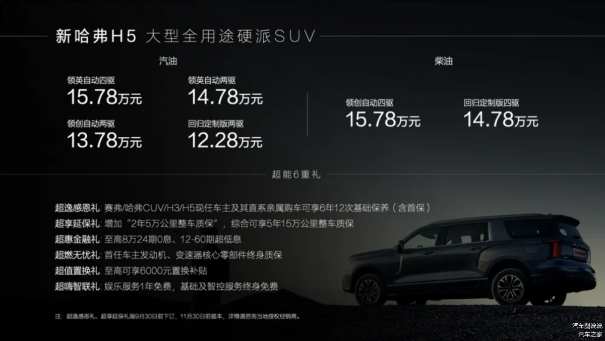 不得不说,新哈弗H5回馈广大消费的支持与热爱是体现在真金白银上的,就拿它提供的两种动力六大版本来看,回归定制版两驱12.28万元、领创自动两驱13.78万元、领英自动两驱14.78万元,领英自动四驱15.78万元,回归定制版四驱(柴油)14.78万元,领创自动四驱(柴油)15.78万元,基本覆盖基础用车需求,加上车身/内饰颜色的自主选择,科技包、舒适包等多种选装,用户可以因需“定制”自己的爱驾,组合适合自己的版本。