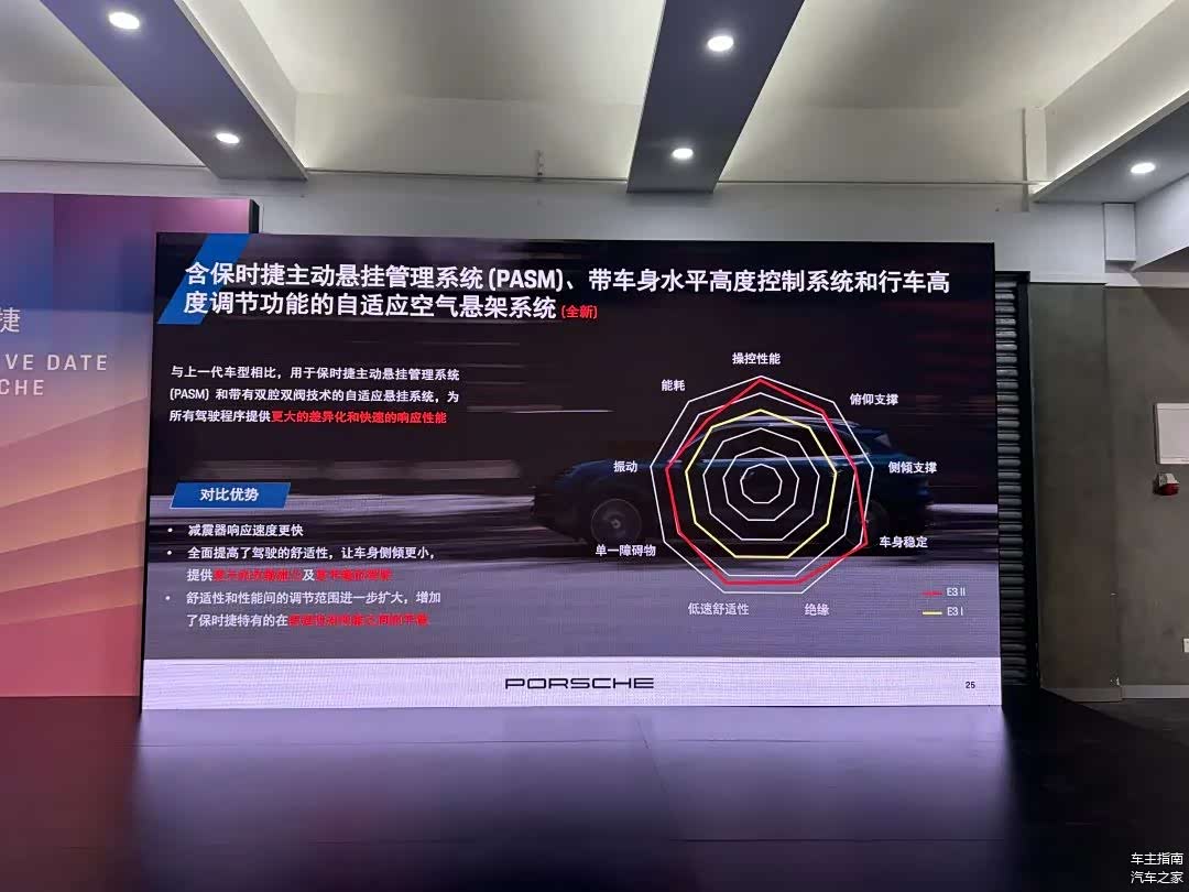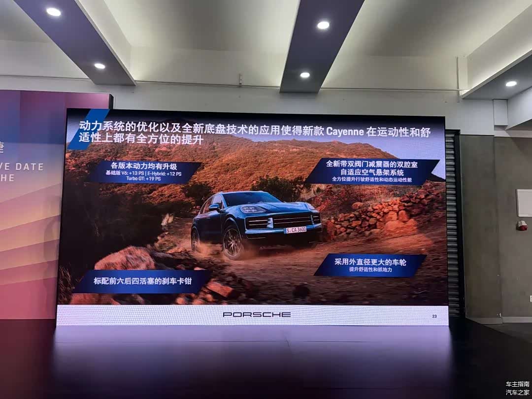 除此之外,新款Cayenne全系标配了带保时捷主动悬挂管理系统(PASM)的空气悬架。新的减震器采用了可独立压缩和回弹的双阀门技术,在所有驾驶模情况下都拥有全面优化的性能,尤其是提升了城市道路慢速行驶时的舒适性,这点相信对于Cayenne的车主们来说意义重大。
