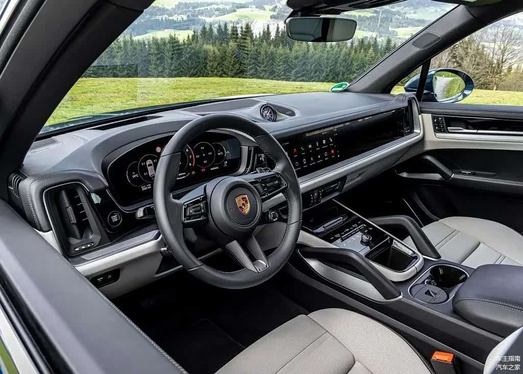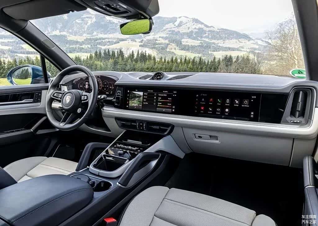 新款保时捷Cayenne的内饰融入了Taycan的设计元素,从仪表板到中控台都经过重新设计,中控由三块屏幕组成,是的,保时捷也不免其俗地玩起了副驾屏,换挡机构也移动到了类似Taycan的仪表台右侧。