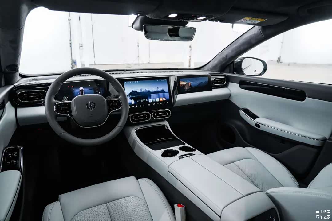 内饰布局同样也没有变化,三块大屏幕如今已经成为了新势力的“标配”。车厢整体用料也相当在线,尤其是翻毛皮的顶棚提供了非常不错的质感。在高配车型上我们甚至能看到后排座椅电动调节,虽然整体乘坐感受比不上那些豪华行政级轿车,但是也确实提升了后排的尊贵感。