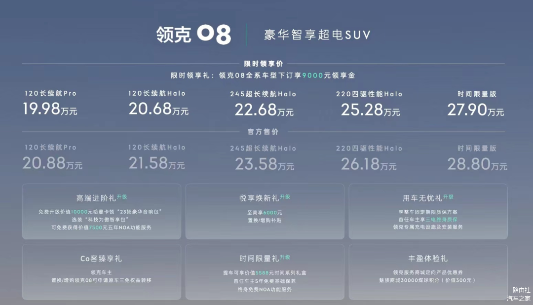 9月8日,北京水立方,定位“豪华智享超电SUV”的领克08正式宣布上市,包括120长续航Pro、120长续航Halo、245超长续航Halo、220四驱性能Halo、时间限量版等在内的首批5款车型,售价区间为20.88万元~28.88万元。