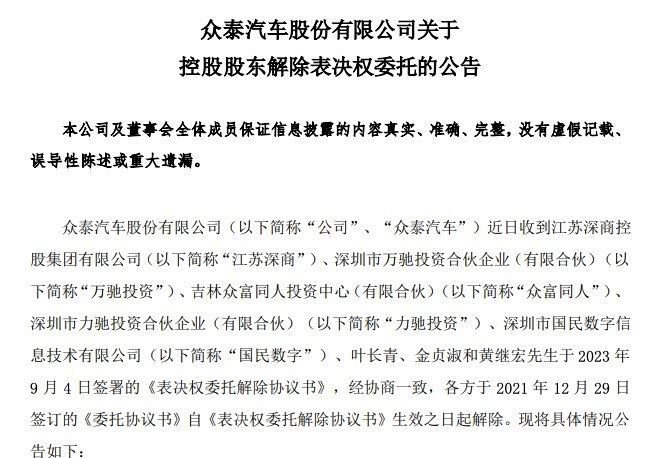 9月4日,众泰汽车发布公告称,通过签署《表决权委托解除协议书》,解除黄继宏拥有24.22%的对众泰汽车股份表决权委托。本次解除事宜将导致公司控制权发生变更,公司实际控制人由黄继宏先生变更为无实际控制人。“公司目前为无实际控制人状态,未来公司实际控制人会如何安排,还需看控股股东方面的安排。”上述众泰汽车相关工作人员表示。