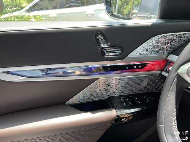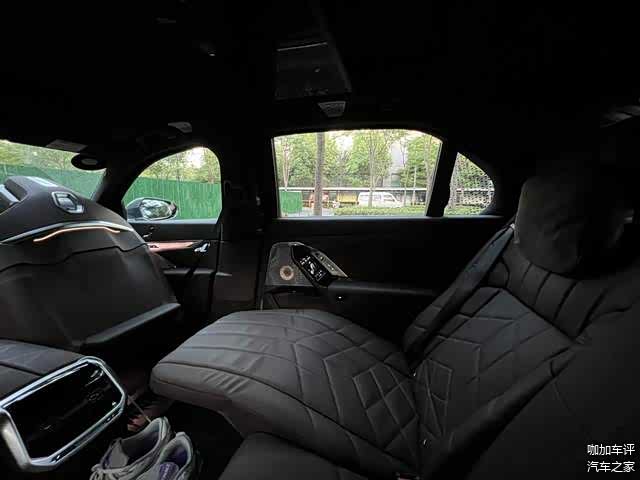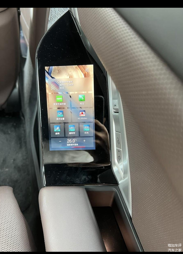 现在的汽车配置,已经卷到要配彩电了,而i7直接来了个31英寸的8k大屏,把彩电的尺寸规格拉满,同时支持触控和车门上的屏幕操控,内置爱奇艺等观看视频的app,不过可惜的是我这台可能是早期的试装车,并没有开通车联网的功能,所以有大彩电却没法看,而且屏幕距离后排也实在太近了,观感并不太舒适。另外可能是地台下面塞了电池包的缘故,后排靠背角度相比汽油版的7系会稍陡一些,放在一台5系上还能接受,7系上就差点意思了。