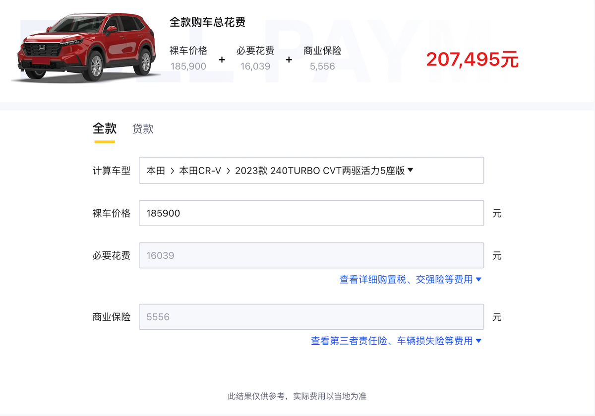 一台入门的2023款本田CR-V 240TURBO 两驱锋尚版 5座车型,我们按照18.59万元的官方指导价计算,其包括购置税、交强险、上牌费、车船税在内的必要购车费用为16039元,后三项费用分别为950元、500元、350元。