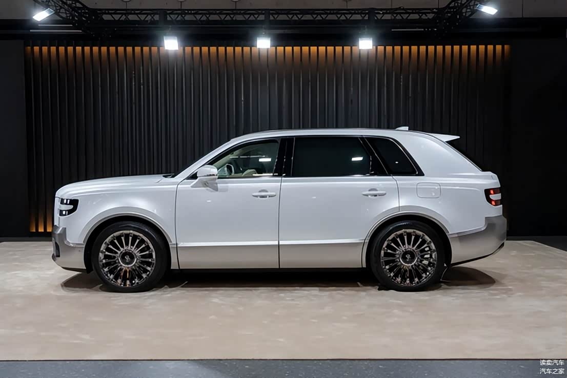 侧面线条简洁平直,D柱宽大而厚重,与劳斯莱斯库里南有些相似。轮圈采用了密辐式设计,尺寸为20英寸。车身包围使用了异色装饰板覆盖,形成双色车身的视觉效果。后排车门提供了两种开门方式,一种是普通打开方式,另一种是侧滑门方式,后者可以让乘客更方便地进出车内。