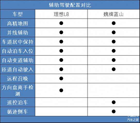 另外在现在消费者很关注的智驾部分,魏牌蓝山和理想L8的表现也都挺出色。魏牌蓝山是搭载了Coffee Pilot2.5辅助驾驶系统,拥有26个硬件传感器加持,主要亮点是高速NOH、智能泊车;而理想L8是配备了理想AD Pro 辅助驾驶系统,硬件传感器为23个,拥有领航辅助驾驶NOA、智能泊车。辅助驾驶等级两车都达到了L2+级,包括并线辅助、车道保持辅助系统、自动变道辅助、自动泊车入位、自动匝道驶入等功能都可以实现,其中魏牌蓝山多了遥控泊车以及循迹倒车功能,而理想L8则拥有远程召唤以及方向盘离手检测功能。