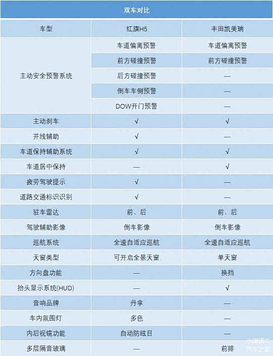 结合配置表来看,红旗H5和丰田凯美瑞的配置都不算特别全面,车道偏离预警、前方碰撞预警、主动刹车、车道保持辅助系统、前后驻车雷达、倒车影像、全速自适应巡航,它们俩都有配备;后方碰撞预警、DOW开门预警、并线辅助、疲劳驾驶提示、道路交通标识识别、全景天窗、丹拿音响、多色氛围灯和内后视镜自动防眩目功能,是红旗H5比凯美瑞多出的配置;车道居中保持、方向盘换挡、抬头显示系统和前排多层隔音玻璃,则是凯美瑞相较红旗H5多出的配置。总体来看,还是红旗H5的配置更丰富一些。