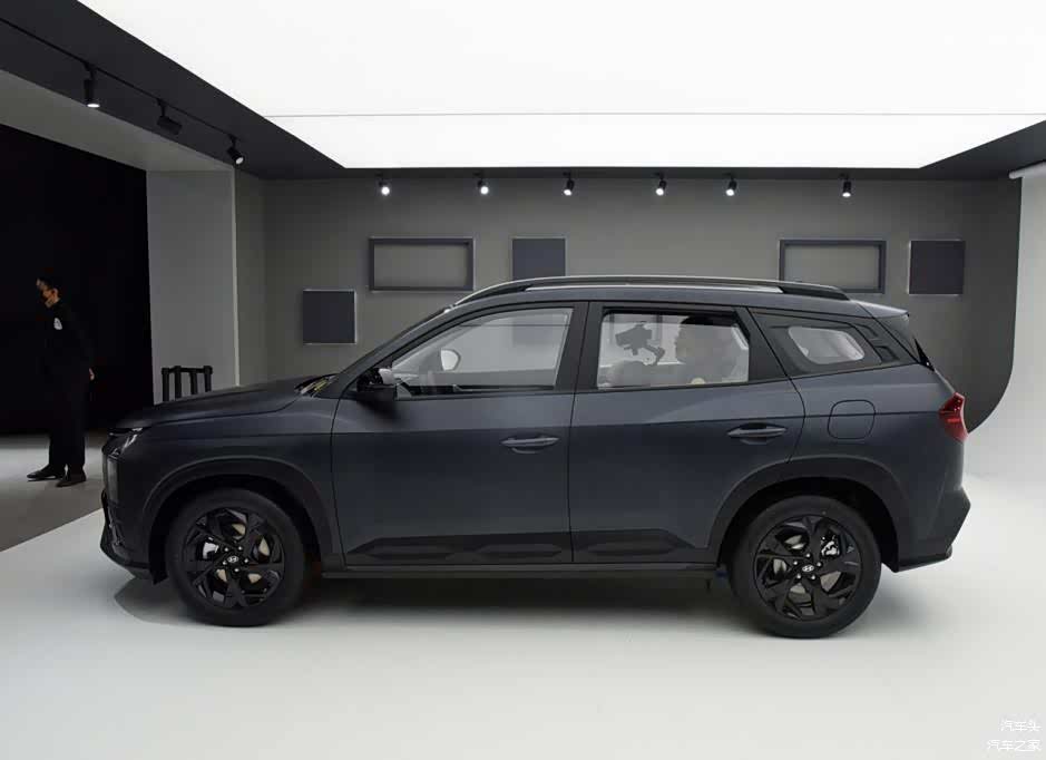 侧面来看,新车造型立体,腰线突出有力,位置在门把手上方。车顶配备了行李架,车柱熏黑,悬浮式车顶的效果跃然纸上。侧裙处也加入了很多线条修饰,分割出力量感的一面,底部的轮毂造型怪异,比较符合年轻人的喜好。新车尺寸为4475/1850/1665,轴距为2680mm,拥有行李架的车型高度增加20mm。尾部的设计挺有意思的,上面是突出的尾翼,灯组采用环形设计,中间是黑色饰板,上面的字母提升了新车的辨识度,底部尾排做了隐藏。
