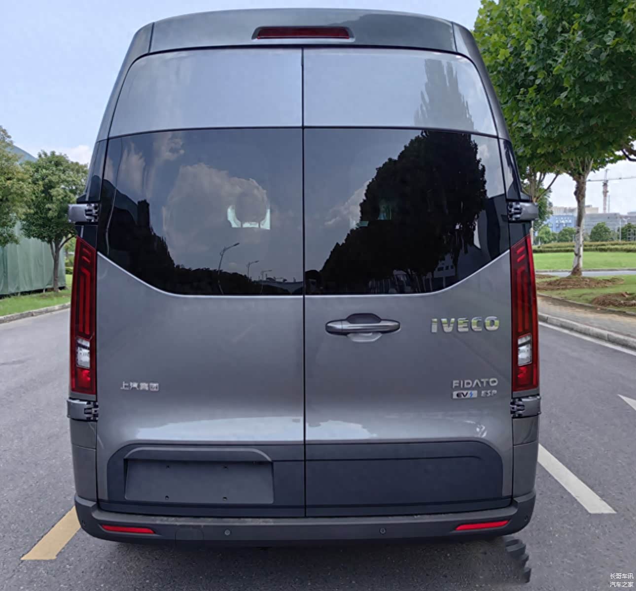 依维柯聚星纯电版外观基本延续了在售燃油版车型设计,采用了菱形网格前格栅造型,尾部采用对开门的开启方式,整体造型延续了燃油版风格。不过,为了突出其纯电动身份,新车在前格栅、轮辋等部位增加了蓝色装饰,并在前后保险杠处增加了“ELECTRIC”字样。此外,新车还提供了不同造型的前格栅、轮辋等选装。