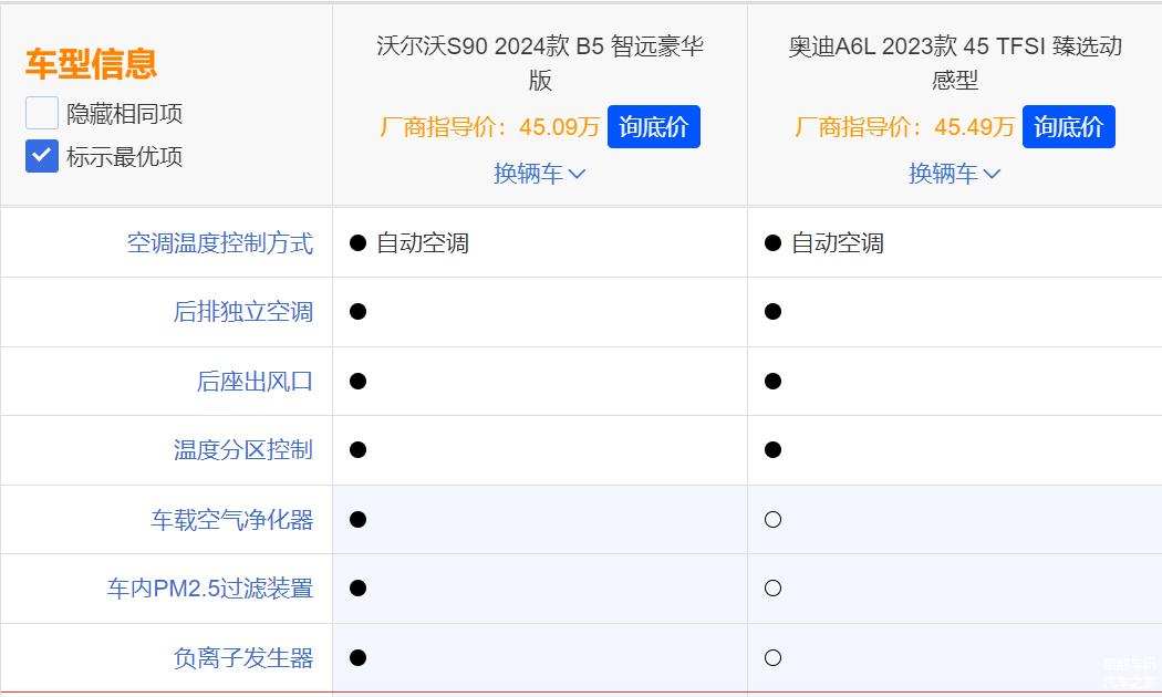 通过以上多个方面的对比,这两款车型可以说是各有千秋,各方面的表现还是比较出色的。整体来说,沃尔沃S90的整体表现更有优势,外观方面的设计优雅大气,车身长度和轴距参数领先奥迪A6L,内部配置和安全配置也更胜一筹,动力配置以及油耗方面的表现的优势也比较明显。奥迪A6L作为一款出色的豪华中大型轿车,整体实力不俗,但是对于太多的选装配置,相比沃尔沃S90的表现稍有逊色。综上所述,预算45万元左右,我个人比较推荐沃尔沃沃尔沃S90 2024款 B5 智远豪华版。如果是你来选择的话,你会选择沃尔沃S90还是奥迪A6L呢?