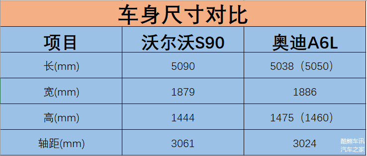 新款沃尔沃S90拥有着充沛的车内空间,这得益于它较大的车身尺寸,长、宽、高分别为5090m、1879mm、1444mm,轴距达到了3061mm,可以提供1026mm超大后排腿部空间,可以为后排乘客带来很好的舒适性;奥迪A6L的车身尺寸方面,长、宽、高分别为5038(5050)mm、1886mm、1475(1460)mm,轴距为3024mm。从车身尺寸的数据来看,沃尔沃S90比奥迪A6L的车身更加修长,并且在轴距方面也有着较为明显的优势。