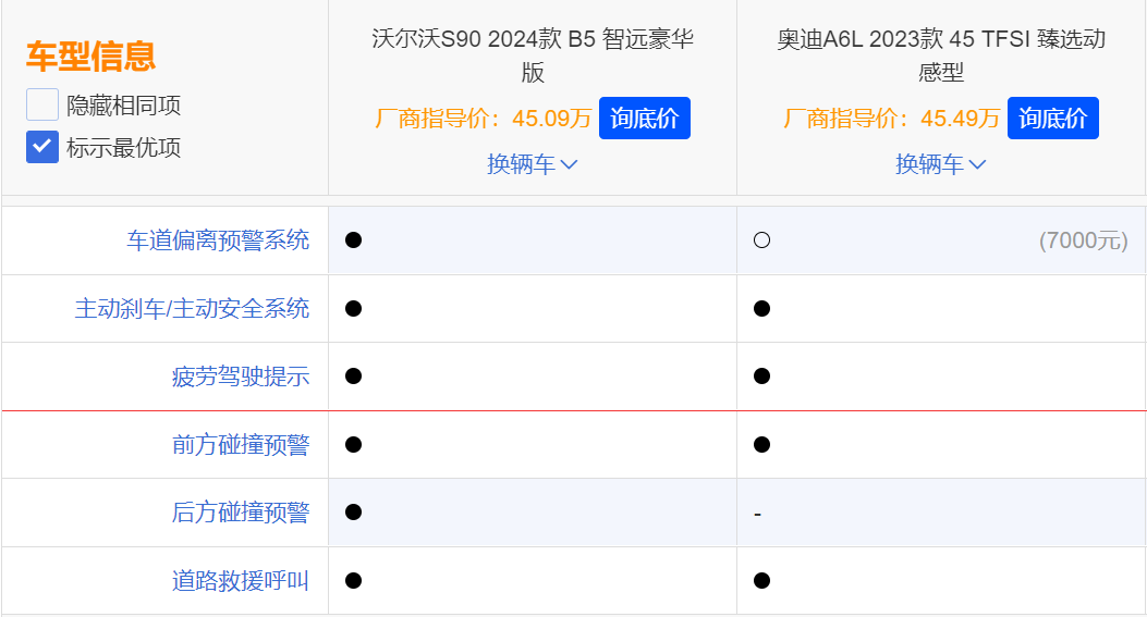 众所周知,沃尔沃非常重视安全性。沃尔沃S90 2024款 B5 智远豪华版具备L2级自动驾驶辅助系统,配备了全速自适应巡航系统、主动刹车、车道偏离预警系统、疲劳驾驶提示、后方碰撞预警、前方碰撞预警、道路救援呼叫等多项主动安全配置;奥迪A6L 2023款 45 TFSI 臻选动感型配备了主动刹车、前方碰撞预警、疲劳驾驶提示、道路救援呼叫等主动安全配置,虽然没有配备车道偏离预警系统,但支持花钱选装。