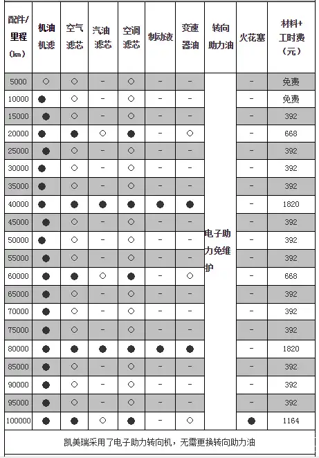 如果这些还不能成为购买凯美瑞的理由,那么车子后续的保养费用更是丰田车型的强项,凯美瑞一年的保养周期厂家推荐是一万公里,需要更换机油机滤,工时费392元,见下附表: