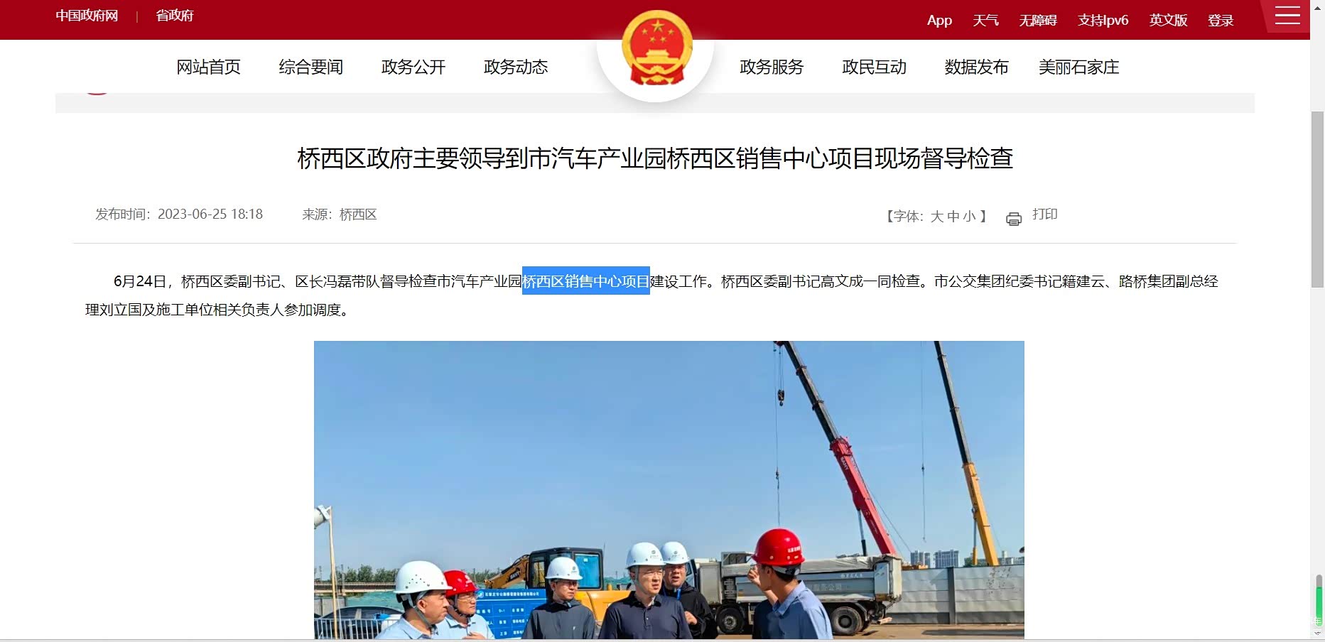 6月25日,石家庄市人民政府网站发布题为《桥西区政府主要领导到市汽车产业园桥西区销售中心项目现场督导检查》的文章,内文显示,6月24日,桥西区委相关领导带队督导检查汽车产业园桥西区销售中心项目的建设工作。文中的现场图片显示,彼时,桥西区销售中心项目已开工建设,推土机、起重机、运输车等设备均已进场。