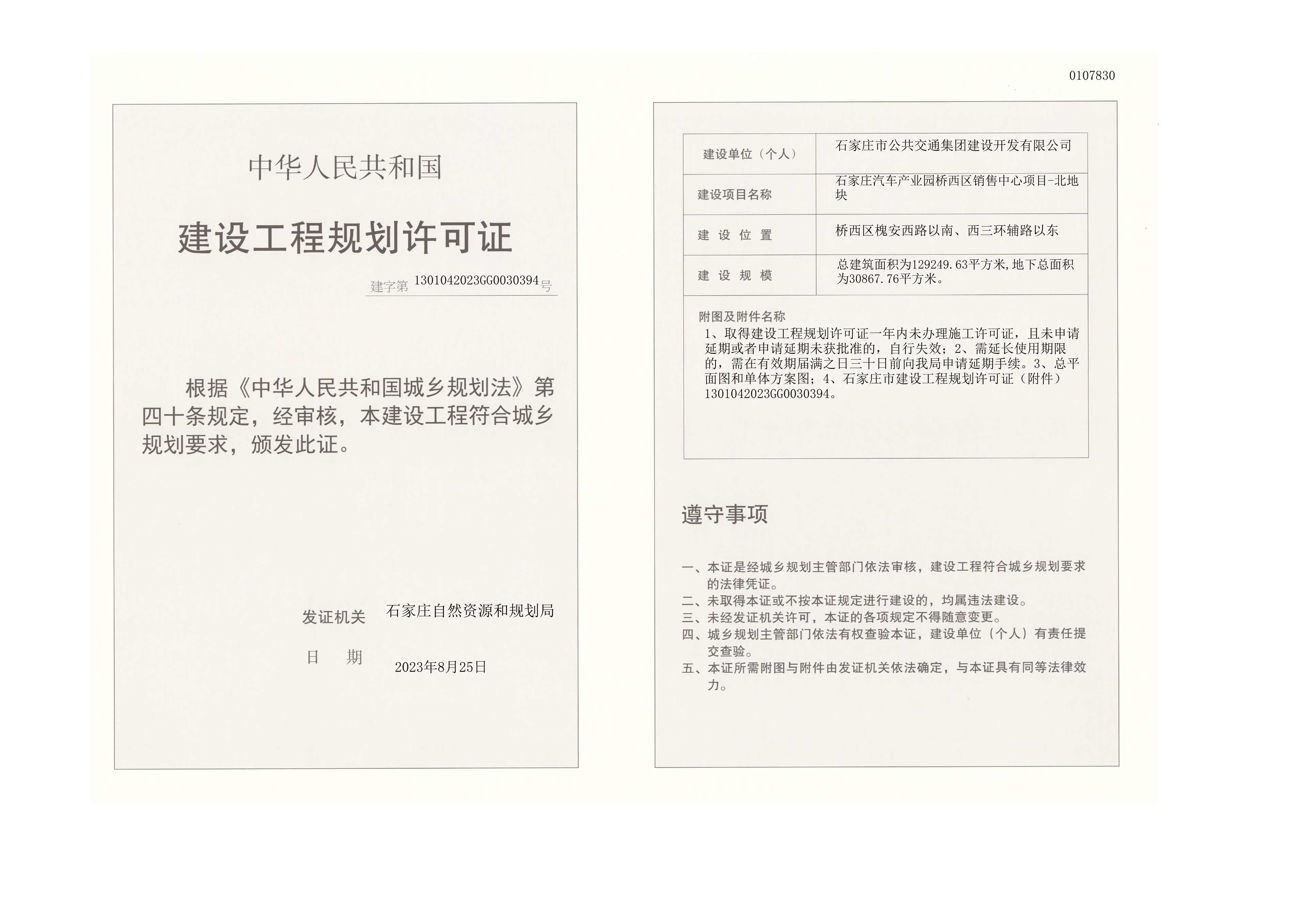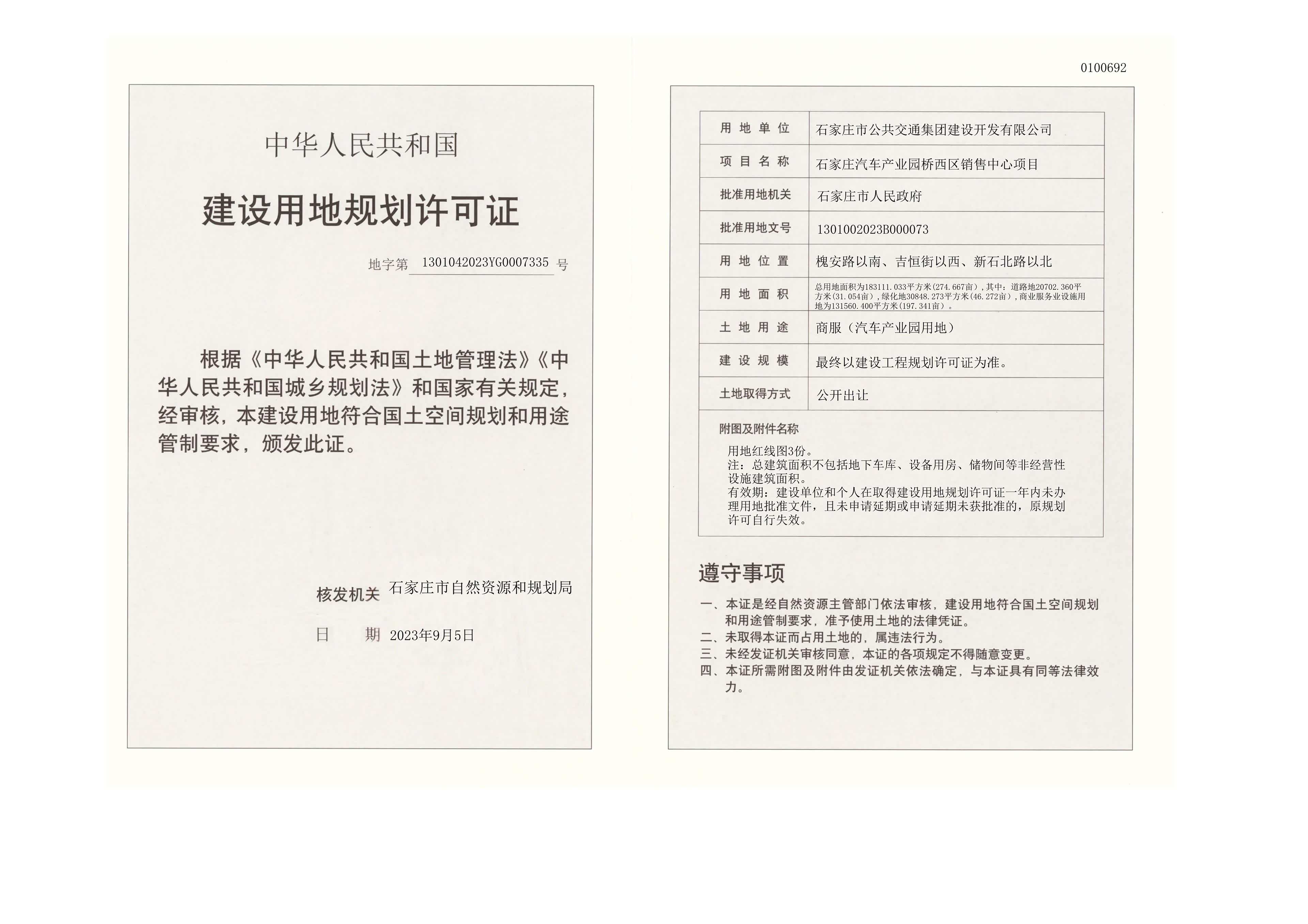 同时,石家庄汽车产业园桥西区销售中心项目——北地块、南地块的建设单位均为石家庄市公共交通集团建设开发有限公司,两项目的建设工程规划许可证上的日期均为2023年8月25日。