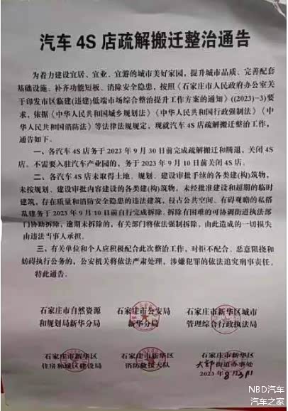 辛瑞提供的一份落款时间为8月31日的《汽车4S店疏解搬迁整治通知》(以下简称《通知》)显示,按照《石家庄市人民政府办公室关于印发市区临建(违建)低端市场综合整治提升工作方案的通知》等法律法规规定,现就汽车4S店疏解搬迁整治工作,要求“各汽车4S店务于2023年9月30日前完成疏解搬迁和腾退,关闭4S店。不需要入驻汽车产业园的,务于2023年9月10日前关闭4S店。”