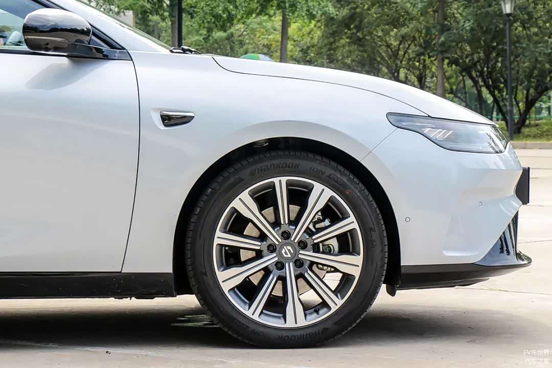 19英寸的十幅铝合金轮毂造型较为简洁,轮胎使用的是专门为电动车打造的韩泰iON evo,尺寸为245/45 R19。