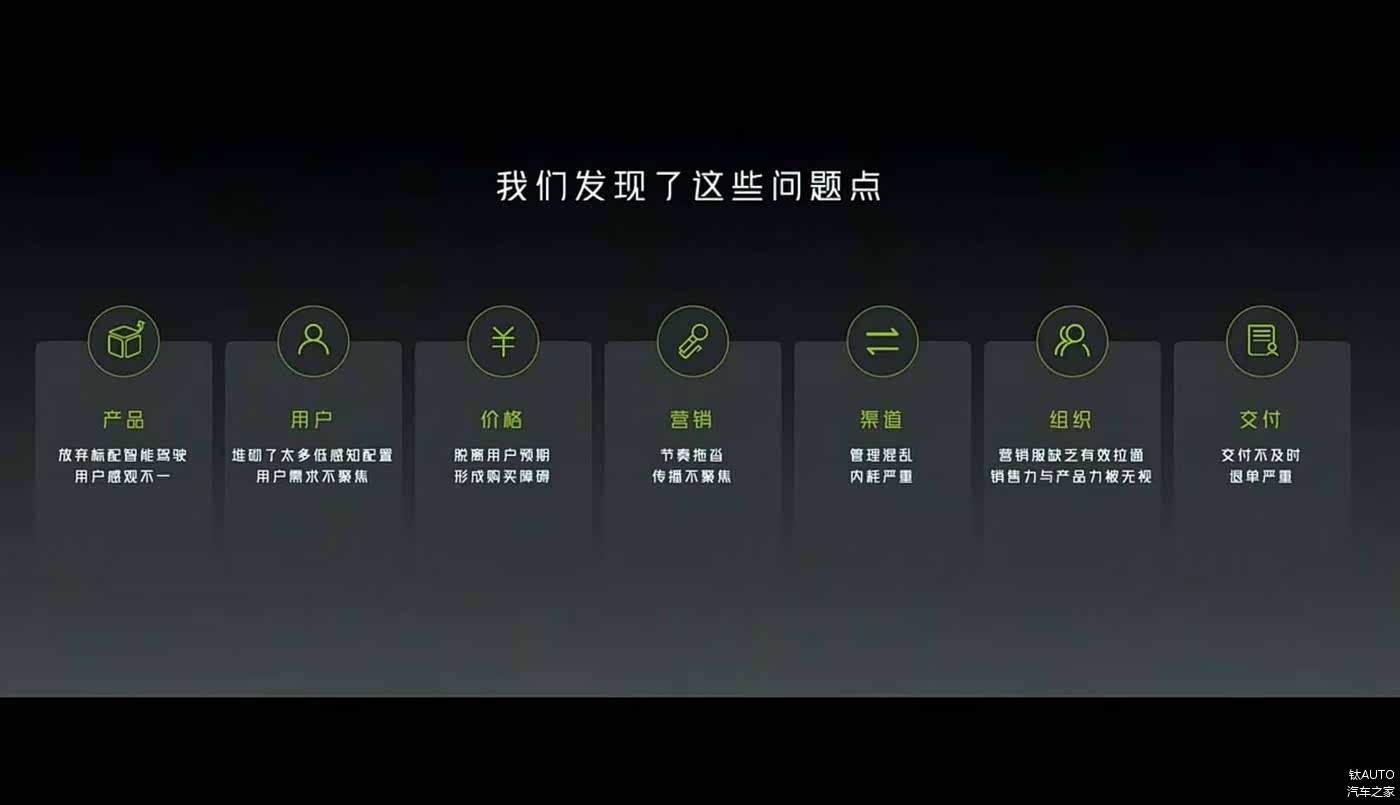 在后来的总结中,何小鹏将去年小鹏 G9 的失利总结了六大问题点,包括产品、用户、价格、营销、渠道、组织、交付,具体来看: