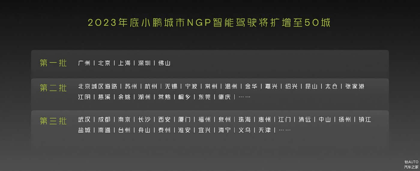 今年 8 月,小鹏汽车无图版本的 XNGP 已在北京落地,计划于年底前在约 50 个城市开放不依赖⾼精地图的 XNGP。在发布会现场,小鹏首次公开了城市 NGP 开城名单,分三个批次进行。
