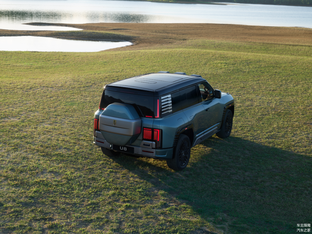 车尾处面积巨大的尾灯组和彰显硬派越野风范的外置备胎,也成为了仰望U8最具辨识度的设计元素之一,尤其是这个尾灯,虽然造型算不上复杂,但是密密麻麻的点阵式LED,在晚上绝对能让人一眼就看出这是一台仰望U8。
