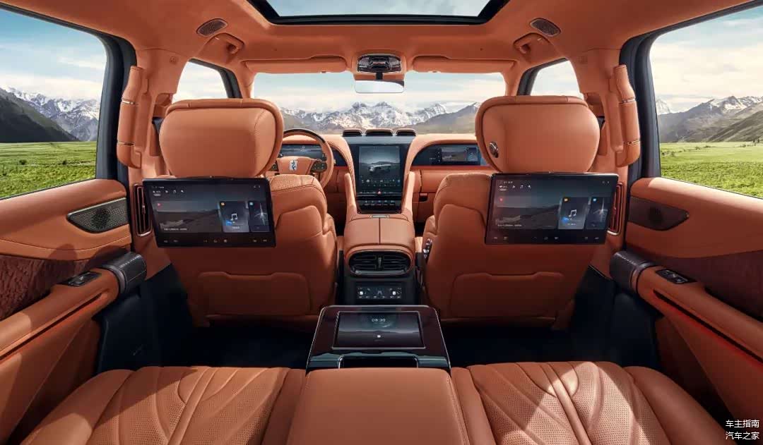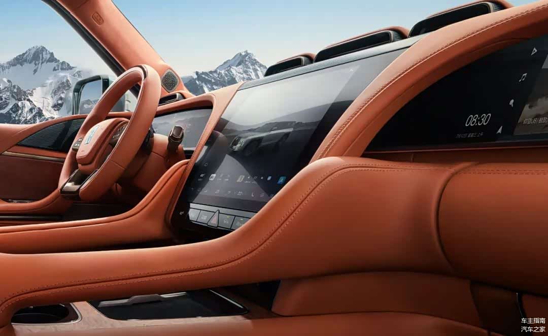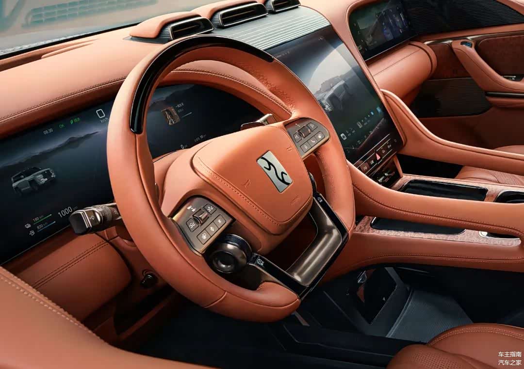 而进入车内,映入眼帘的就是大面积的橙色皮质包裹,豪华气息扑面而来,根据官方资料显示仰望U8不仅用上了Nappa真皮座椅,同时连木纹点缀饰板使用的都是珍贵的沙比利木材,以进一步突出整车的尊贵感。