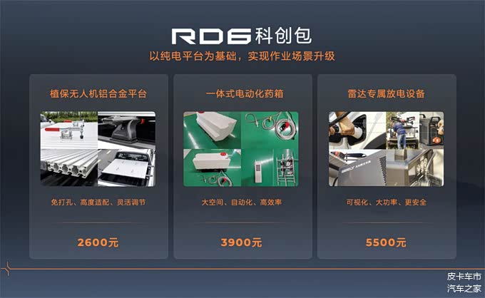 针对乡村用车场景,助力科技兴农的雷达RD6科创包同步发售,共包含植保无人机铝合金平台、一体式自动化药箱以及专属放电设备三大组件,分别售价2600元、3900元以及5500元。