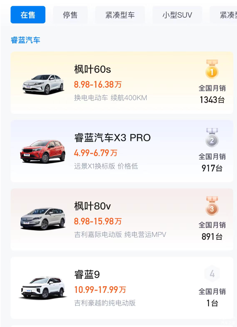 翻看睿蓝汽车此前发布的产品,比如枫叶60s/PRO、枫叶80v/PRO以及睿蓝X3 PRO等等,我们不难发现一个共同点,那就是低价且高性价比,甚至燃油小型SUV睿蓝X30 PRO的起售价仅需4.99万元,完全就是那些想要买车但预算低的家庭第一辆车的价格。