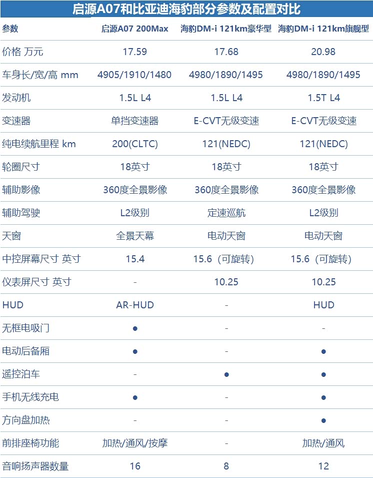 仔细对比启源A07和海豹的配置,启源A07增程版的顶配200Max版与价位接近的海豹DM-i 121km豪华型相比,A07的配置水平明显要更高一些,并且其纯电续航里程也长出不少。而海豹如果要达到类似的配置水平则需要上到旗舰版车型,但价格上却贵了3万元以上。