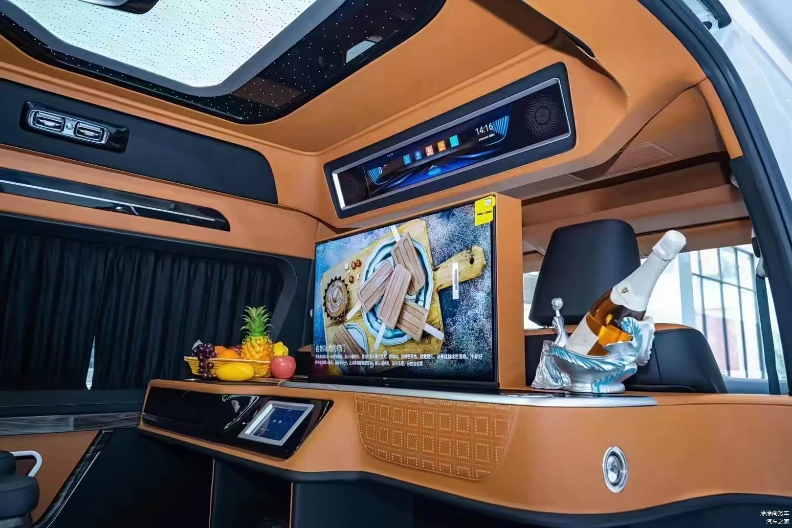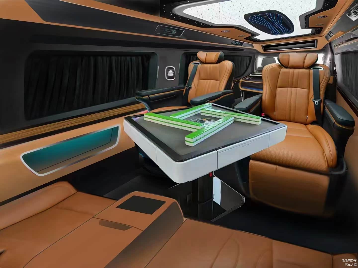 一般这个区域都是定制一个可拆卸的小桌板以供休闲娱乐,今天这台车在这里定制一张车载麻将桌,这可是非常少见的哦!也就是说,这是一台可以打麻将的私人定制版,不知道车主是有多喜欢打满将啊。吧台位置还有一台车载烧水壶,这样一来麻将、茶水都齐活了......