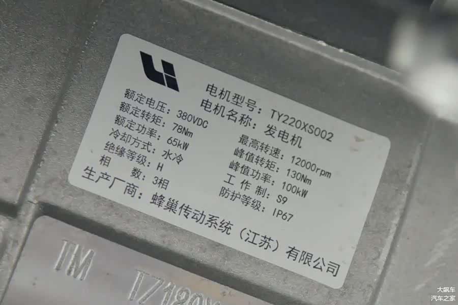 前电动机来自蜂巢动力,最大功率100千瓦,最大扭矩130牛米,额定功率65千瓦,工作电压380伏的直流电机,最高转速12000转/分钟,所有参数与理想L9一样。