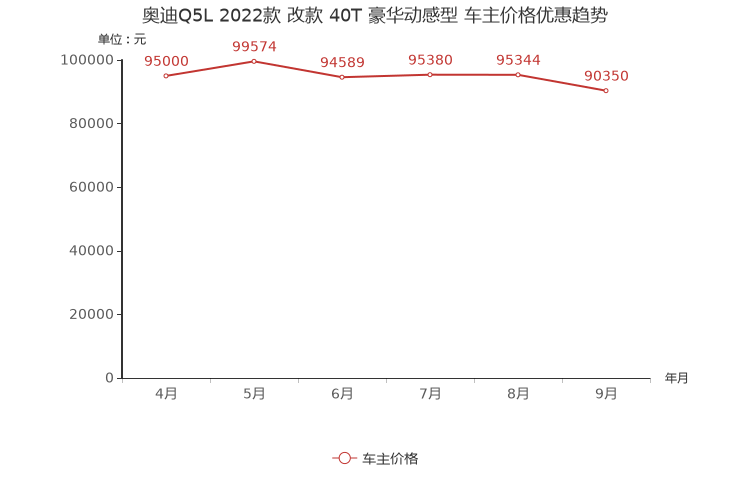 从车主价格优惠趋势数据来看,奥迪Q5L的价格在过去几个月有所波动。4月份的价格优惠为95000元,5月份上升至99574元,6月份再次下降至94589元,7月份为95380元,8月份为95344元,9月份为90350元。可以看出,奥迪Q5L的价格在一定程度上呈现出下降的趋势。