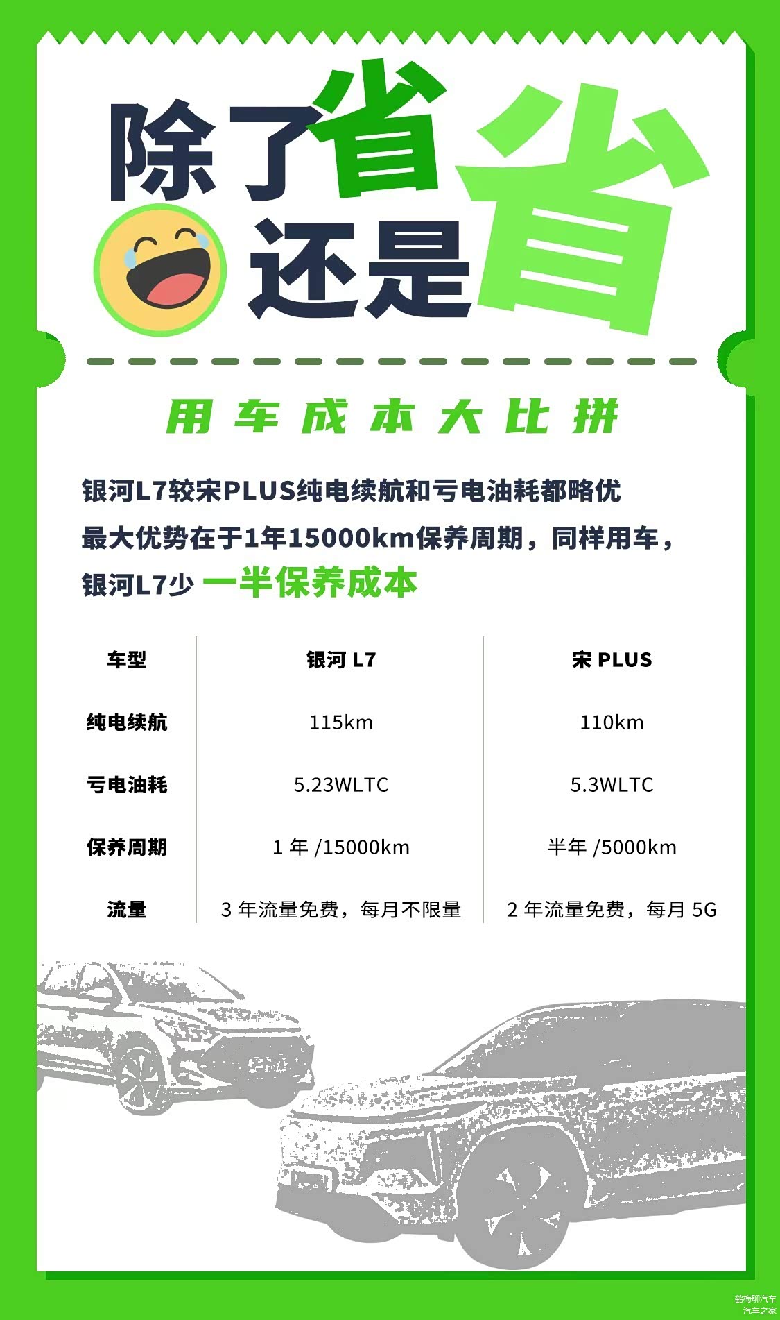 从价格上看,银河L7的官方指导价为13.87-17.37万,而宋PLUS DMI冠军版的官方指导价为15.98-18.98万。作为吉利新能源中高端系列首款车型,银河L7在外观、性能和安全方面都展现出了为用户打造极致驾乘体验的用心。银河L7不仅在性能和安全性方面表现出色,而且价格也较为友好。同样是混动SUV,宋PLUS DMI是半年/5000公里保养一次,而银河L7是1年/15000公里保养周期,用车成本更省一半。