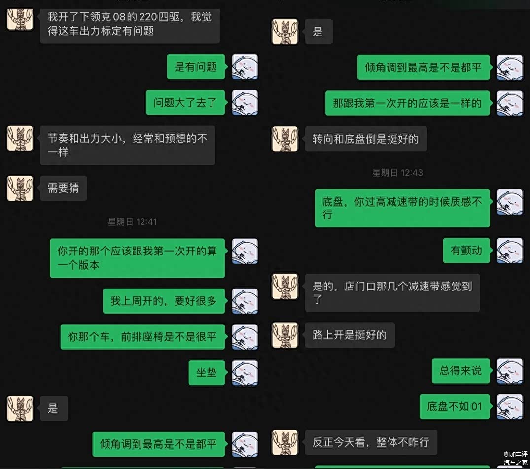 【离谱的试驾车】文章开篇时,我就已经介绍了,文章中的试驾体验是基于我的第二次试驾得出的,虽然第一次试驾的车型也是220四驱性能Halo版,但那台车与我第二次试驾的车型至少有四个方面的差异,一是前排驾驶座椅的坐垫倾角调节幅度特别小,即便调整到最高,坐垫也很平,必须采用高坐姿驾驶才能很好承托腿部;二是那台车的HUD显示效果更差,上面的字体像是写在一张揉皱的纸上一样,形变更明显;三是车机系统版本不同,我试驾那台车的车机甚至都没有激活倒车影像功能;四是那台车的驾驶性标定更糟糕,甚至都不是Tip-in响应不合格了,驾驶时必须特别特别特别缓踩油门,哪怕只是稍微踩快一点点,动力释放都跟不上,并且在这种情况下动力输出的强度和节奏与驾驶员的预期完全不符,可以说是极难开。同时,我的好朋友,另一位汽车博主 @Alonso512 也在当地找到了试驾车进行了试驾,他的试驾感受与我第一次试驾的感受相同,很多活跃在我评论区的网友,试驾后也给出了几乎相同的结论。
