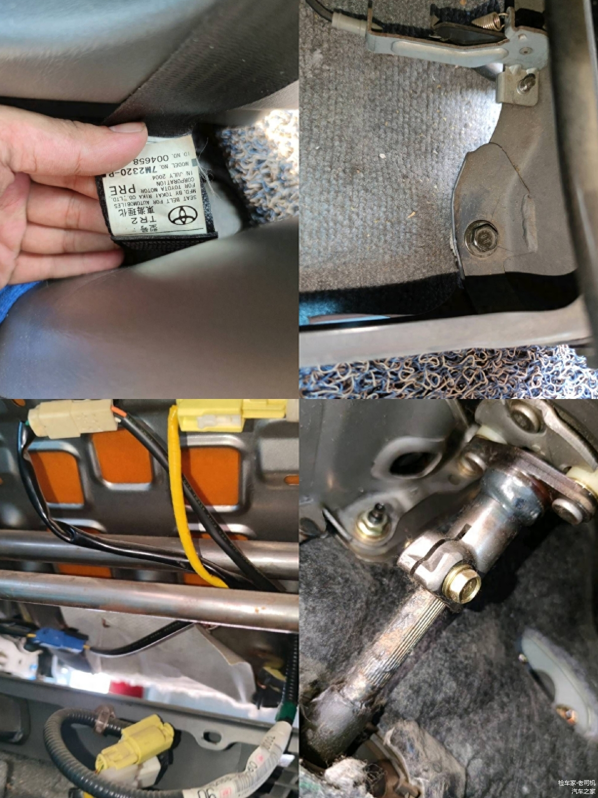 安全带的制造日期在出厂日期范围内,可以确定没有更换;座椅螺丝有拆卸,可能是之前有维修,下面的金属件和线路都没有泥沙,方向机管柱也没有生锈和拆卸,目前没有水泡的痕迹!