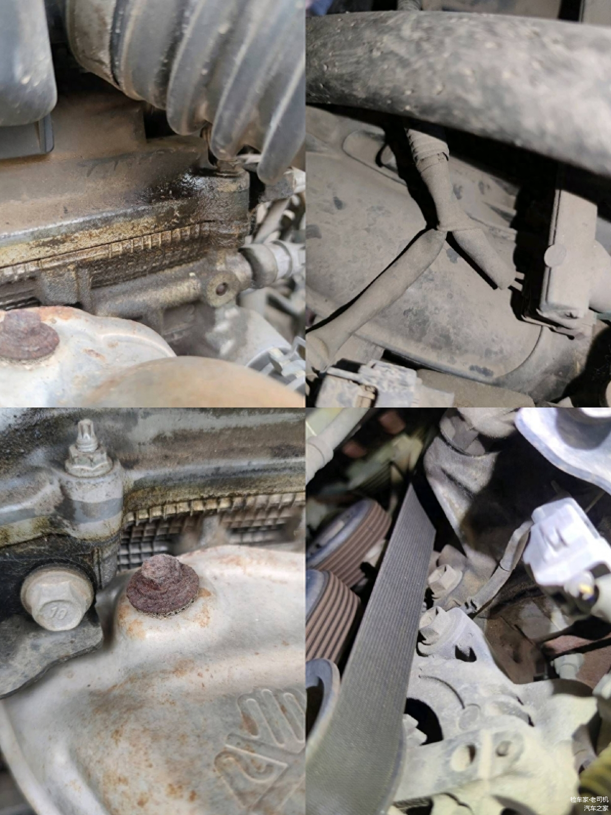 往后看发动机本体,气门室盖、进气排气歧管以及正时盖都没有动过,也就不存在吊装分解大修的可能!这么多年了,仅仅只是气门室盖漏油,老一代日系车的发动机素质,不服不行啊!