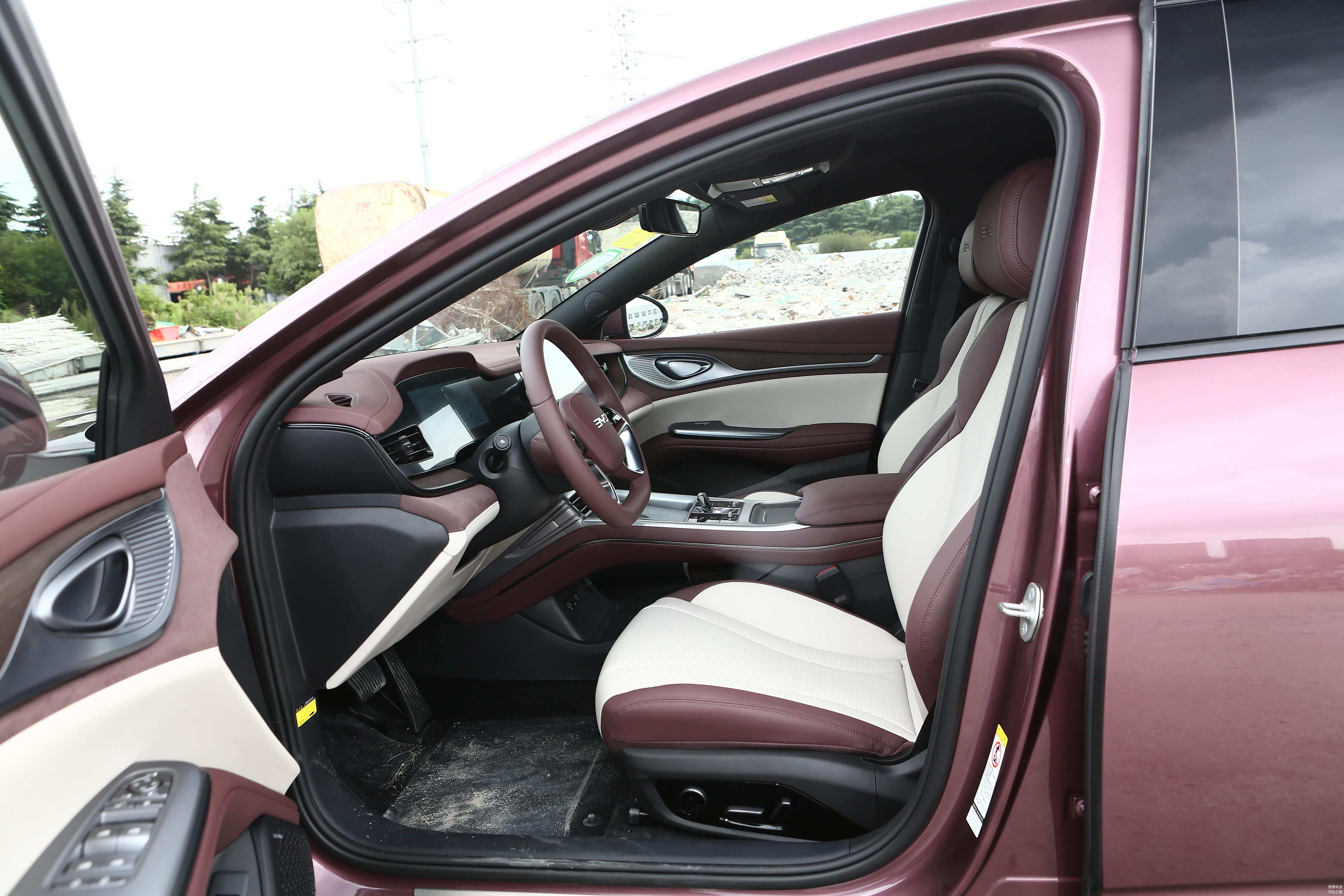 内饰方面,包括中控台和空调出风口均采用了左右对称的布局方式,悬浮式中控屏则位于中控台中央,搭配平底多功能方向盘和全液晶仪表盘,中控台台面也覆盖了不少软皮质包裹材料,手感和高档感营造得不错。