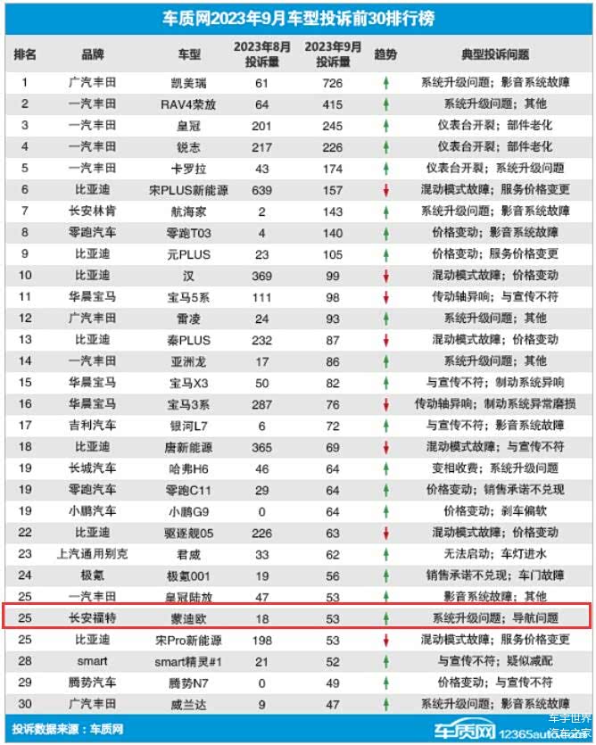 在这种情况下,2023年9月份,由于部分用户投诉其存在着“导航问题”、“系统升级问题”等,福特蒙迪意外进入了同期车质网发布的车型投诉榜。
