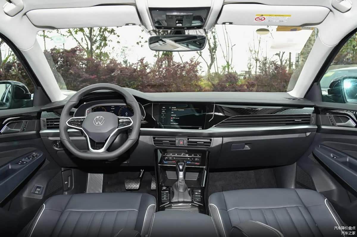 进入车内,T型中控台结构依然是帕萨特的标配,大量横向元素的使用也体现出德系品质的严谨,车内更多区域采用了烤漆材质的饰板,副驾前方的饰板还加入了类似浮雕式的点阵装饰,无论在触感还是观感上都有更立体的表现,台面中央配有一款内嵌中控屏,下方则为空调控制区,更高的集成化也大幅减少了实体按键的数量,让挡把区域更显简洁。