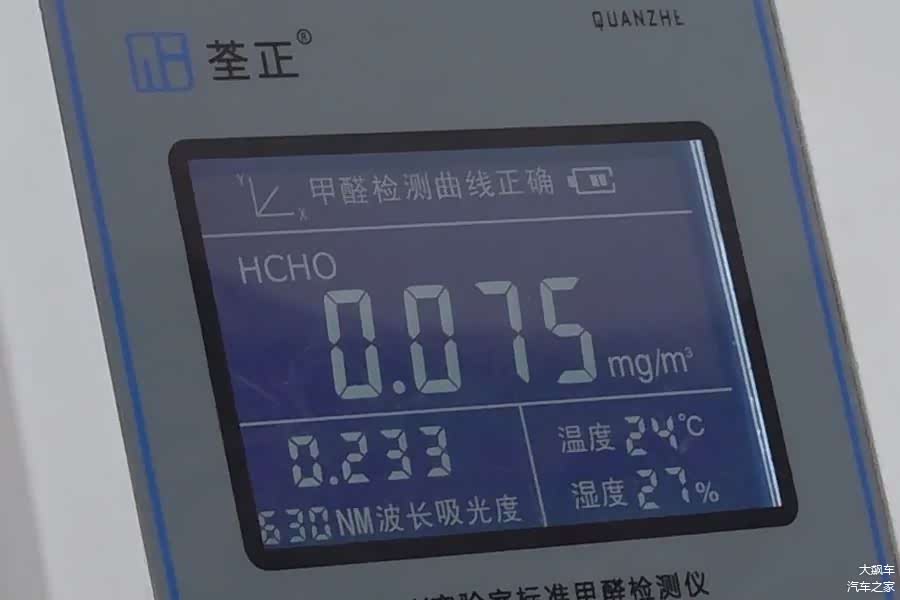 经过在23±1℃恒温环境中16小时的封闭,这辆车的车内空气甲醛释放量测量数值为0.075毫克每立方米。