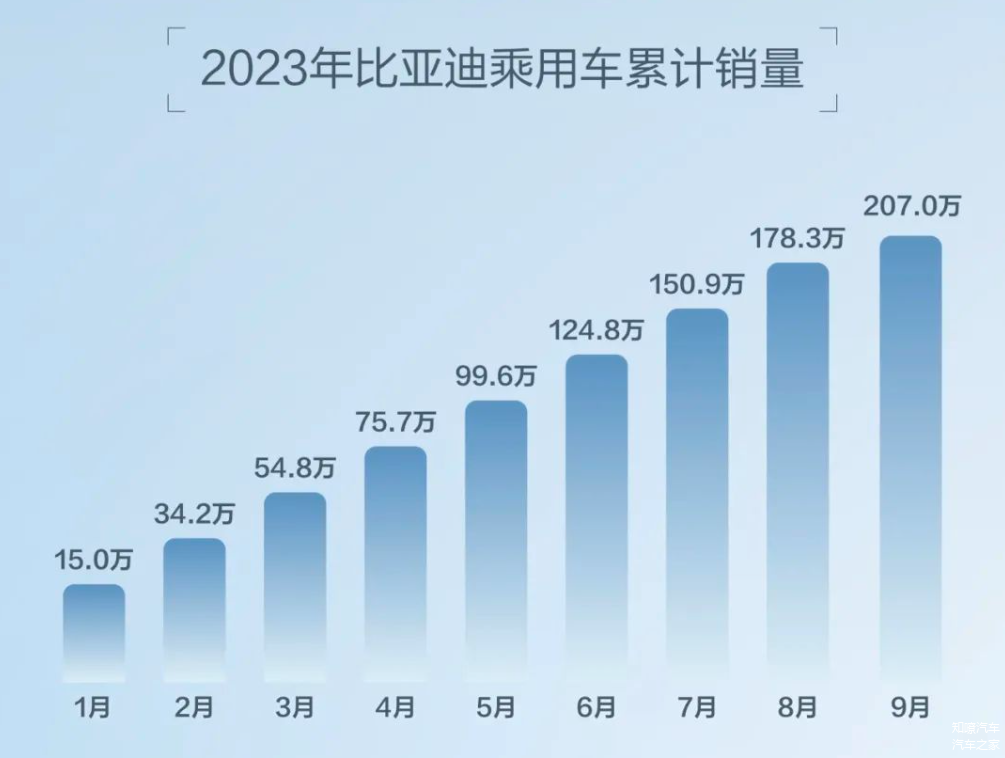 随着销量的不断攀升,比亚迪的规模化效应愈发明显,也因此能产出更多与市场上品质相同但价格更低的车型,这点是其它车企短时间内无法超越的,截止到9月底,比亚迪2023年的累计销量已达207万台,如果按照这个强劲势头发展,再加上仰望和方程豹,300万台的年销量目标指日可待。