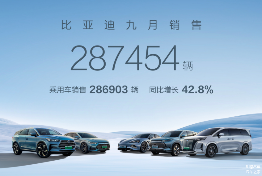 根据比亚迪官方公布的数据,9月份汽车总销量为287454台,其中,王朝家族总销量133806台,海洋家族总销量139841台,两大主力系列旗鼓相当,豪华品牌腾势总销量13156台。