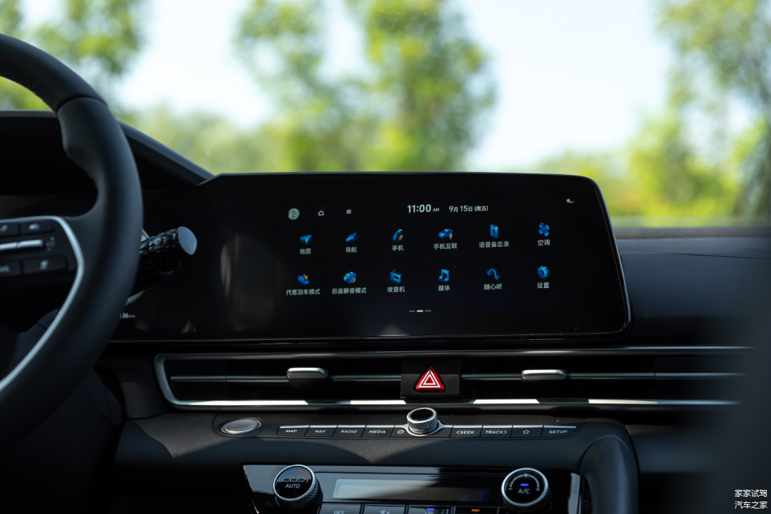 坐进车内,全新 伊兰特和朗逸更是截然不同的风格。相比外观朗逸的内饰可以感受出一些年轻化设计。对称式的中控台是大众的经典设计,中控屏微微偏向驾驶员一侧,屏幕尺寸为12英寸,屏幕的分辨率还不错,显示效果比较细腻,而且大众车型在屏幕里的功能布局是很清晰的。