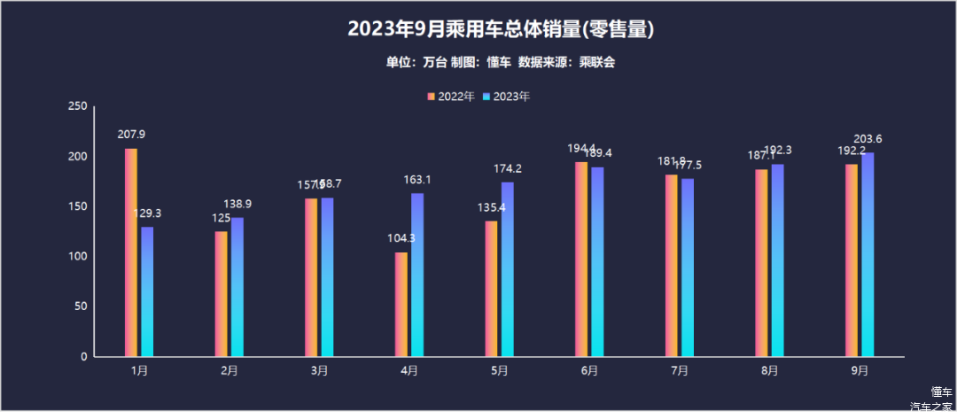 10月11日,乘联会(cpcaauto.com)公布了9月汽车(乘用车)销量(零售)数据:9月汽车市场总体销量为203.6万台,环比上月增长5.8%,同比去年9月增长5.9%,看来今年的“金九银十”购车季要比去年更猛烈。