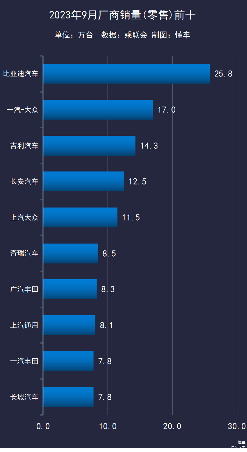 真正与下一名拉开差距的只有比亚迪,9月销量为25.8万台,比第二的一汽-大众多了8.8万台,差出了一个奇瑞的销量。