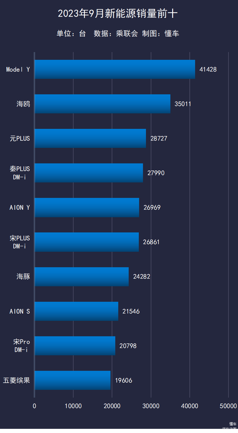 新能源方面,和以往一样,特斯拉Model Y位列第一,比亚迪海鸥排第二。