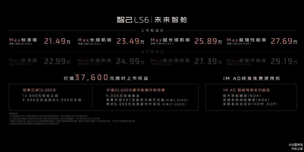 智己汽车第二款纯电动SUV—— 智己LS6(图片 | 参数 | 询价)上市,新车定位依旧是中大型纯电SUV,共推出4款车型,官方售价22.99-29.19万元。在2023年11月12日24点前锁单用户,还可享受12000元现金立减和2000定金抵扣5000车款,也就是1.5万元的购车优惠,优惠后售价21.49-27.69万元,这价格相当划算。今天我们就来看看智己LS6的4款车型,究竟哪款更值得购买。